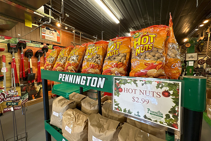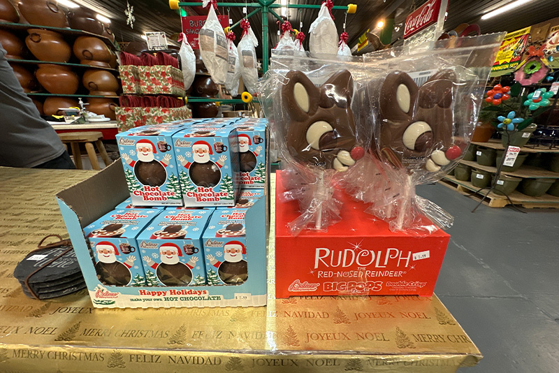 If you are a pecan-lover, you’re in luck during our Christmas season months of November and December. We sell pecans in every way imaginable, from pecan logs and chocolate-covered pecans to praline pecan cookies and pecan pie. Individual bags, pecan samplers, and gift baskets may be purchased.